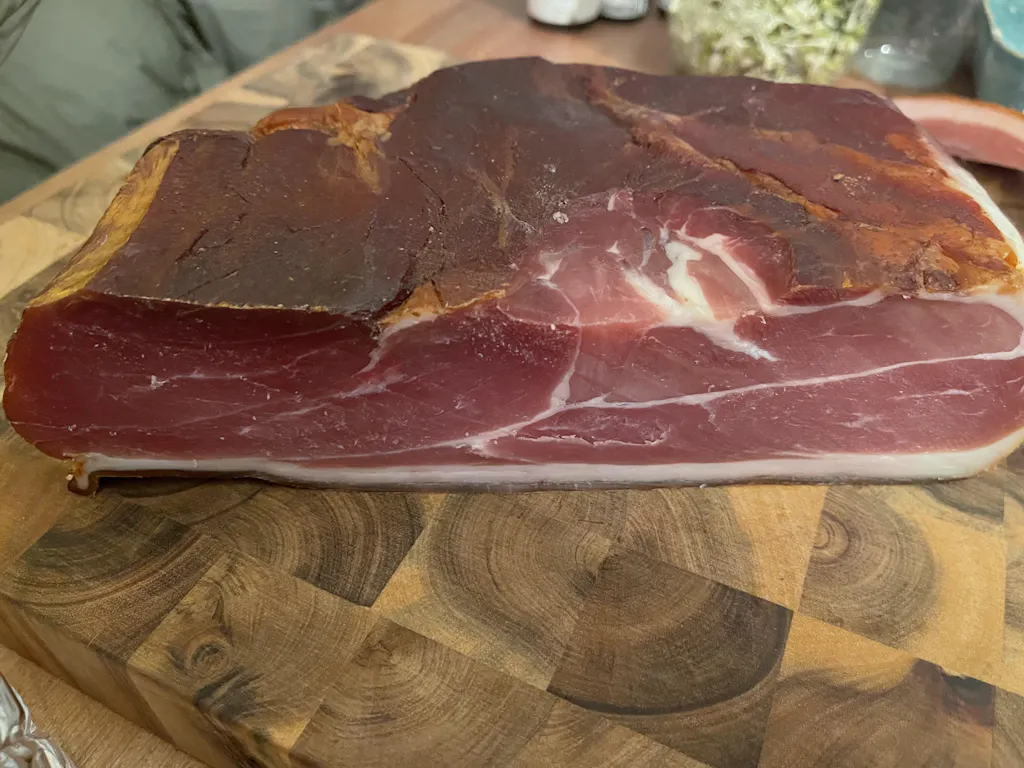 Sehr gute Qualität! Typisches rauchiges Aroma zart im Biss und feine gleichmäßige Textur. Schneeweiße Speckschicht. War schon der zweite Schinken den wir gekauft haben. Preis Leistung perfekt.